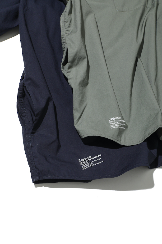 細部におけるテープ使いやライナー着脱用のボタンまでミリタリーを踏襲しながらも、軽くしなやかな高密度のタイプライタークロスを2枚重ね1枚として縫製することで独特なパッカリングと空気を含んだ立体的な雰囲気を表現している。