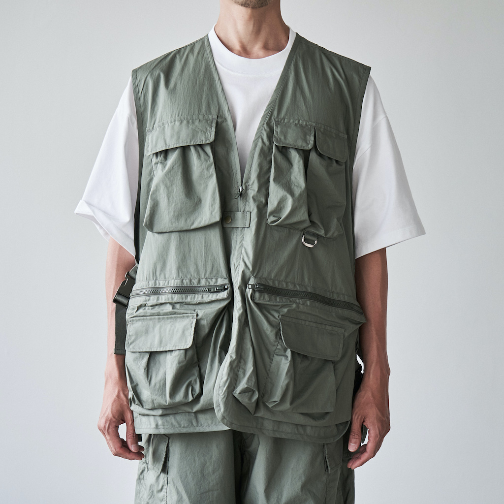 都市生活に必要な道具を携帯することに着目した様々な規格のポケットを搭載したベスト。