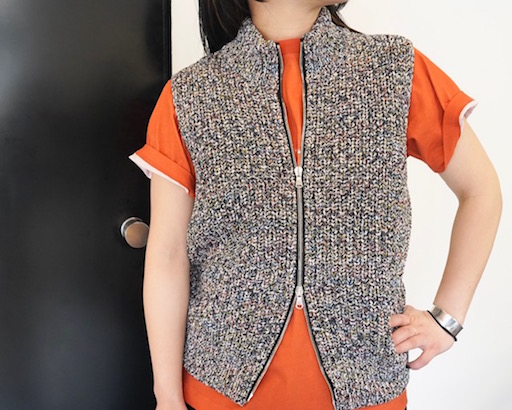 ダブルジップのニットベストがアクセントとなり