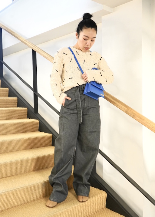 柔らかなベージュにワイドデニムで