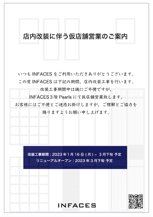 この度INFACESでは下記の期間、店内改装工事を行います。
