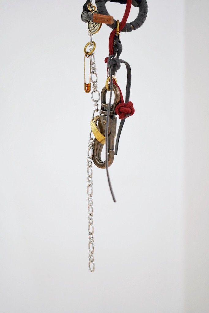 kolorオリジナルのかぎホックやリング、安全ピン、コインなどなど組み合ったデザイン。