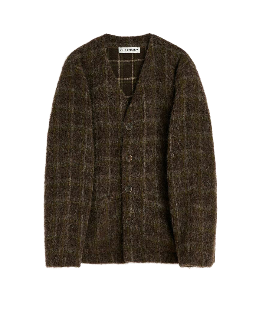 柔らかな毛羽立ちを感じるウール混紡のカーディガン。温もりのあるチェック柄が目を引き、羽織るだけでスタイリングの主役に。軽やかな仕上がりでレイヤードにも最適だから、シーズンをまたいで長く活躍します。カジュアルさと上質さを絶妙に共存させるあたりは、やはりOUR LEGACYならでは。