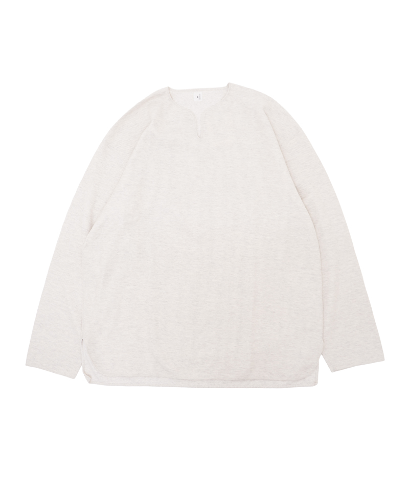 表面はワッフルのように凹凸があり、裏面はフラットに編まれたオーバーネックサーマル。普段カチッとしたシャツよりサーマルなどラフなロンTを着る日が多い気がします。このサーマルは肩幅や身幅に少し緩さを持たせたシルエットで、洗い加工を施しているため、通常の洗濯で縮みがほとんど出ないのも安心です。緩さがありながらもオーバーネックで他と差が出るサーマル。メインでもインナーとしても幅広いスタイリングにおすすめです。