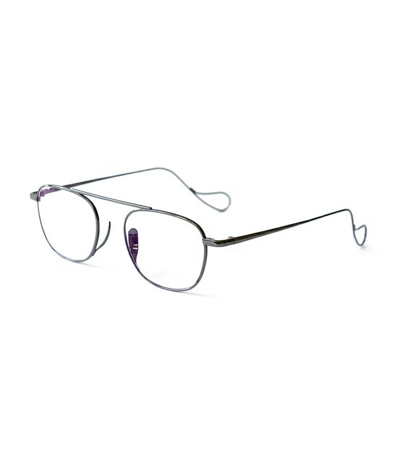 "g" (ゲー) を継承したスクウェアシェイプに、直線のバーブリッジが特徴的なバランスのよいメタルフレーム。 ノーズパットには、古いヨーロッパの眼鏡にみられたアンダースローなメタルパットを使用。 クラシカル且つモダンな印象を持つデザインとなっています。