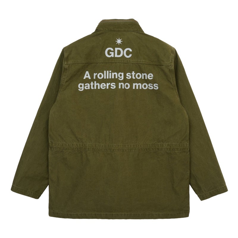 M-65フィールドジャケットをベースに、現代的な解釈でアップデートしたモデル。襟内部に収納できるフード、ベルクロ袖口、胸ポケットと腰ポケット、ドローコード付きの裾とウエスト、取り外し可能なライナーなど、多機能なディテールを搭載。 背面には “A Rolling Stone Gathers No Moss.” のメッセージを配し、ポケット上にはブランドを象徴する8芒星のSTAモチーフをエンブロイダリーで表現。定番として押さえておきたいカーキ、削ぎ落とされた強さを纏うブラック、上品な印象を与えるベージュ。中でも、タイガーカモをベースにオリジナルパターンでGDCロゴをさりげなく忍ばせたテキスタイルは、遊び心を持ちながらも形やシルエットはヴィンテージライクに設計し、耐久性と軽さを両立させた。ミリタリー由来の機能美に、GDCらしい思想を重ねた一着。
