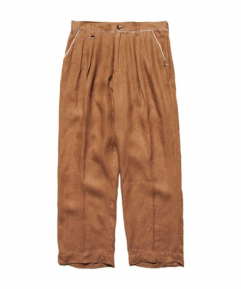 先染めのリネン糸を用いたツイル生地に洗い加工や起毛加工を施しているUEオリジナルファブリックの2タックワイドパンツ。