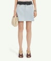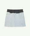 コントラスト素材のレイヤード素材を裁ちっぱなしのままウエストに配した、ひねりのあるデニムミニ。