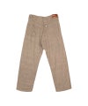 レーヨンラミーギャバジン素材のワーク型ワイドパンツ。 シルエットは股上が深めでワイドシルエットの5ポケットタイプになります。 ポケットサイドにはEND CUSTOM JEWELLERS制作のロゴ入りのリベットを使用しバックポケットが大きいのも特徴的です。 フロントポケット地はウエスタン柄をあしらったスレキを使用。 同素材のジャケットもありますのでセットアップとしても着用可能。 素材は、レーヨンを3本撚り合わせた糸とラミー糸で共にトップ糸を使いトーン差を付けてシャンブレーで表現を出した素材でレーヨンの光沢感のある表面をあえて裏にしドライ感のある裏面の表使いしたのも特徴的なギャバジン素材です。