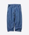 VintageのミリタリーAll In Oneをベースに上下で切り離し、各々を単体で着用できるようにアレンジしたボトムス。つなぎの下半身を 切り取ったデザインのため、極端なウエストの大きさ、深めの股上などとてもユニークなデザインに仕上がりました。オリジナルのデ ザインを踏襲し、サイドを切り替えていないためとても贅沢に生地を使用しており、着用した時のバランスが特徴的なアイテムです。 同素材のトップスと合わせた際にAll In Oneとして着用できるよう、ウエストにはドローコードを配しました。 1950~60年代にUnion Ticketでお馴染みの様々なワークブランドが加入していたUnion (Union Made )の規格で作られたSanforized(防 縮加工)仕上げがされた10ozの2/1ライトハンドワークデニムを再現したワークデニム。染色、糸使い、密度、打込などは当時のデッド ストックを分解・解析して再現した生地。織布については生産性を考え当時同様の旧式力織機ではなく敢えて革新織機で再現していま す。