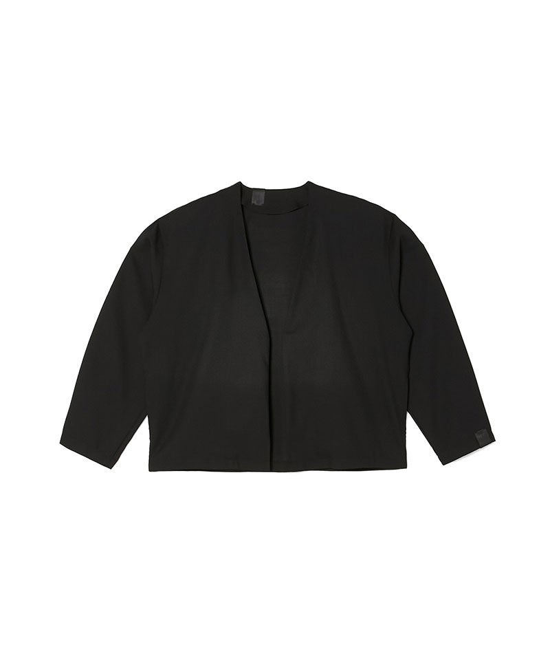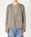 できる限りディテールを削ぎ落とすことで完成した、ボタンレスのカーディガンシャツ。 Vラインのネック、筒袖がソリッドな印象に。左袖にはN.HOOLYWOOD COMPILEのアイコンであるブラックのブランドネームを配置。BLACKを除くカラーには配色ステッチを施し、奥行きのある表情に。 ドロップショルダー、ややオーバーサイズのボックスシルエット。 極細のポリエステルとウールの強撚糸を単糸で織り上げた、薄く軽量な生地。高温多湿な時期にも適したドライな肌触りが特徴。家庭洗濯が可能。