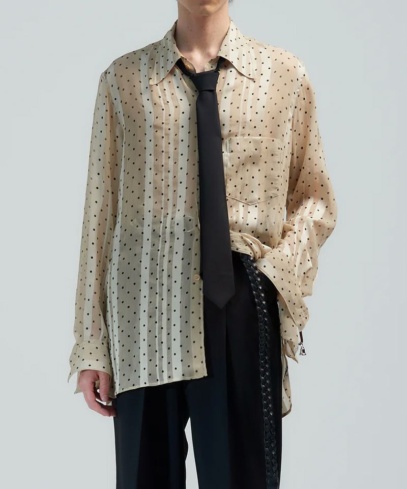 シーズンテーマである"wink"が冠されたシアーシャツ。特徴的なドット柄とさりげなく佇むサテンのストライプ。絶妙なコントラストが奥行きを加え、ブランドらしい1枚に。生地はシボが特徴的な楊柳組織とサテン切り替えの軽やかなものを使用し、動きのあるシャツに仕上げた。引き続き、襟元のボタンで着脱・位置調整が可能なネクタイも付属。