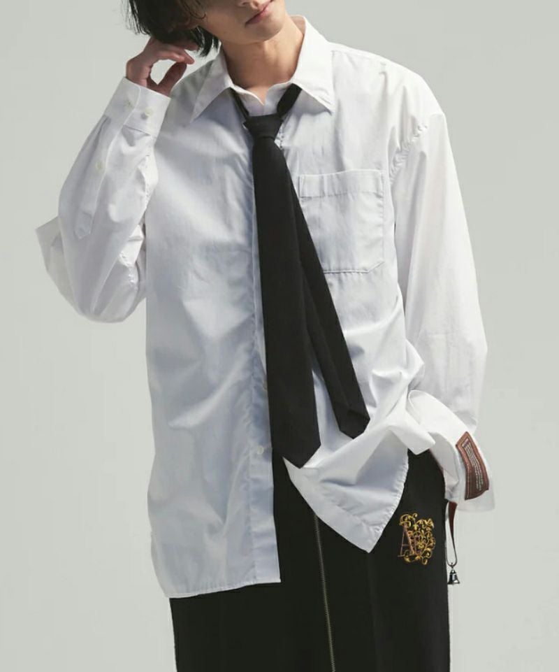 襟元のボタンでゆるさの2段階調整、そして取り外しも可能なネクタイ付きシャツ。
