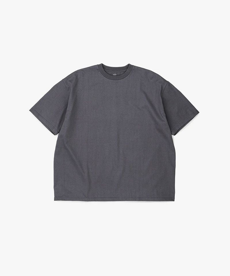 日本に数台しか稼働していない貴重な吊り編み機で作成した、しっかりした厚みとコシのある屈強な丸胴天竺を使用したオーバーサイズTシャツ。定番のパックTeeで使用している吊天竺は30番綿糸を2本で撚るところ、3本撚りにした糸に空気を含みながら時間をかけてゆっくりと編み上げた素材。洗濯後も伸びにくく、脇に縫い目も無いため肌に縫い代があたらず、着心地が良く透けないのが特徴。
