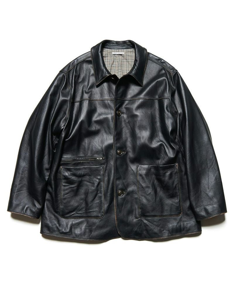 1950~60年代のヴィンテージアイテムのような風合いを特殊な染色によって実現したレザーカーコート。柔らかで保温性のあるシープレザーは長く着続けるほどに味わいが増し、身体により馴染んでいきます。裏地にコットンチェック地を採用することでレトロUKパンクのエッセンスを盛り込むなど、クラシックなアイテムをUEらしくモダナイズしています。