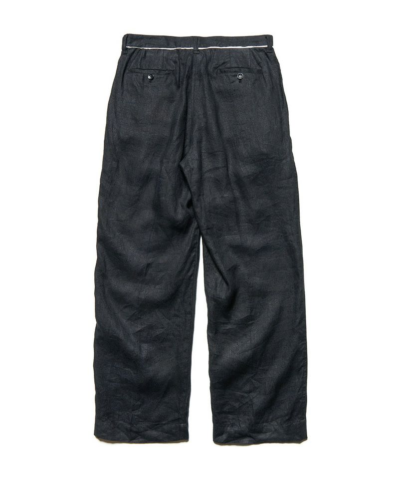 先染めのリネン糸を用いたツイル生地に洗い加工や起毛加工を施しているUEオリジナルファブリックの2タックワイドパンツ。