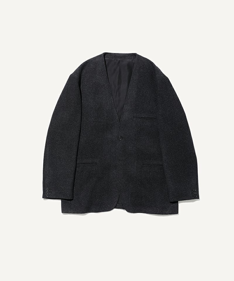 やや長めに設定した着丈でナチュラルショルダー、適度にゆとりを持たせたカーディガンのような