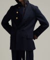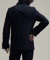 ピークドラペルのダブルブレストジャケットは、襟を立てて着用することも可能です。