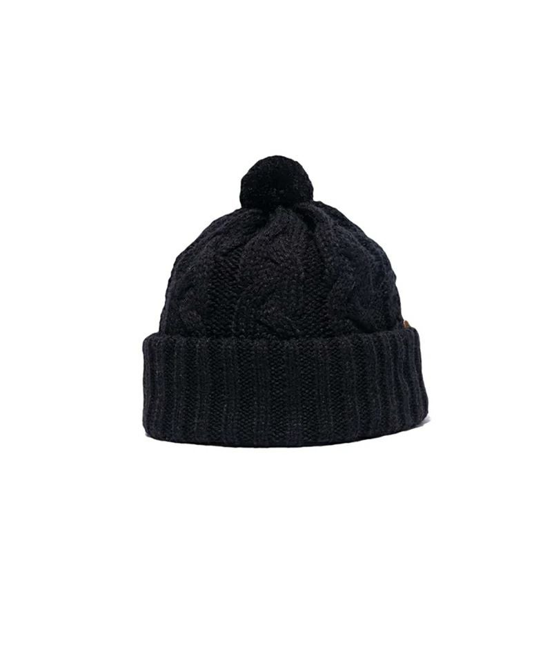 直径6cmのポンポンが付いた、ケーブル編みと折り返しリブを組み合わせたニット帽。 深さも充分にあり、被り口も大きく、ゆったりとした被り心地です。 発色の良い光沢感のあるアクリルをウールに混ぜた糸を使用しており、ふっくらとした風合いで保温性と防寒性にも優れ、さらに、アクリルの質感がウールのチクチクを感じさせず、肌触りが良いのも特徴です。