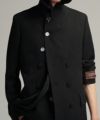 ピークドラペルのダブルブレストジャケットは、襟を立てて着用することも可能です。