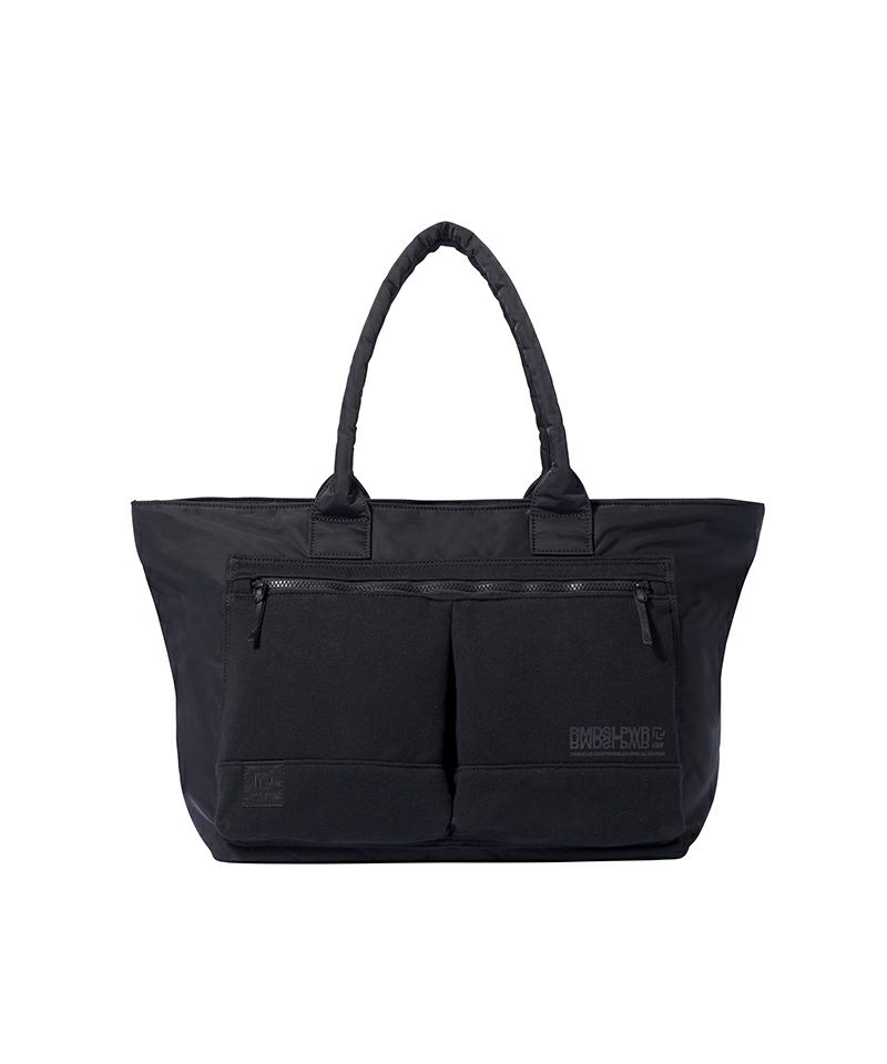 荷物の出し⼊れが容易な広い間⼝設計でデイリーユースには⼗ 分な容量を備えたトートバッグ。内装には⼩物収納⽤のメッ シュポケットの他に、両サイドにはペットボトルや折り畳み傘 の収納に便利なボトルポケットを装備。LOOPWHEELER, RAMIDUSのロゴがエンボスで表現されたネックストラップが 付属します。
