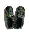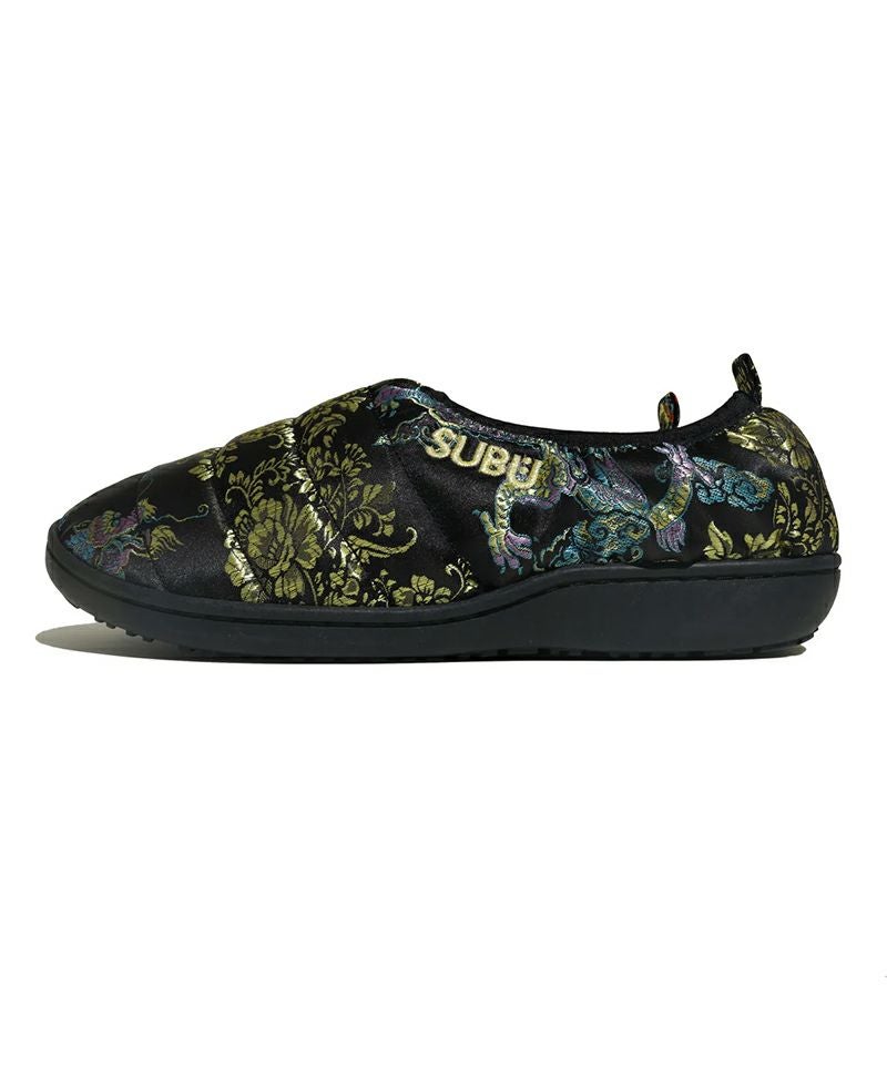 チャイナドレスを思わせる艶やかな織り柄と漆黒のベースに浮かぶ模様が、足元にエレガンスと異国情緒を添えます。