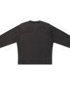 ピグメント加工されたボディと同生地の "取扱注意" のアップリケが背中に、ボディと同系色の刺繍ワッペンが左胸に配置されたクルーネックスウェット。
