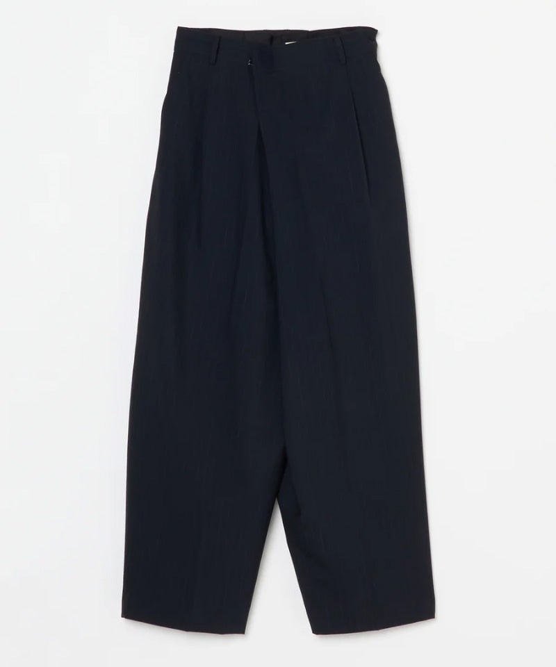 ウエストをラップしてホックを引っ掛けて着用することで裾に向けて出るドレープが特徴的なパンツです。