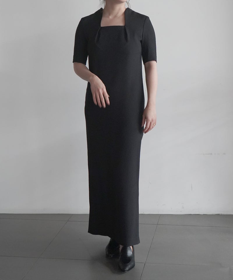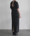 折り畳まれた様なネックラインと大胆に開いた背中のデザインがしなやかな曲線を描きセンシュアルな印象を与える。裾のスリットに二の腕までカバーする5分袖、緻密なパターンメイキングによる立体的なシルエットがエレガントかつアクティブな1着。