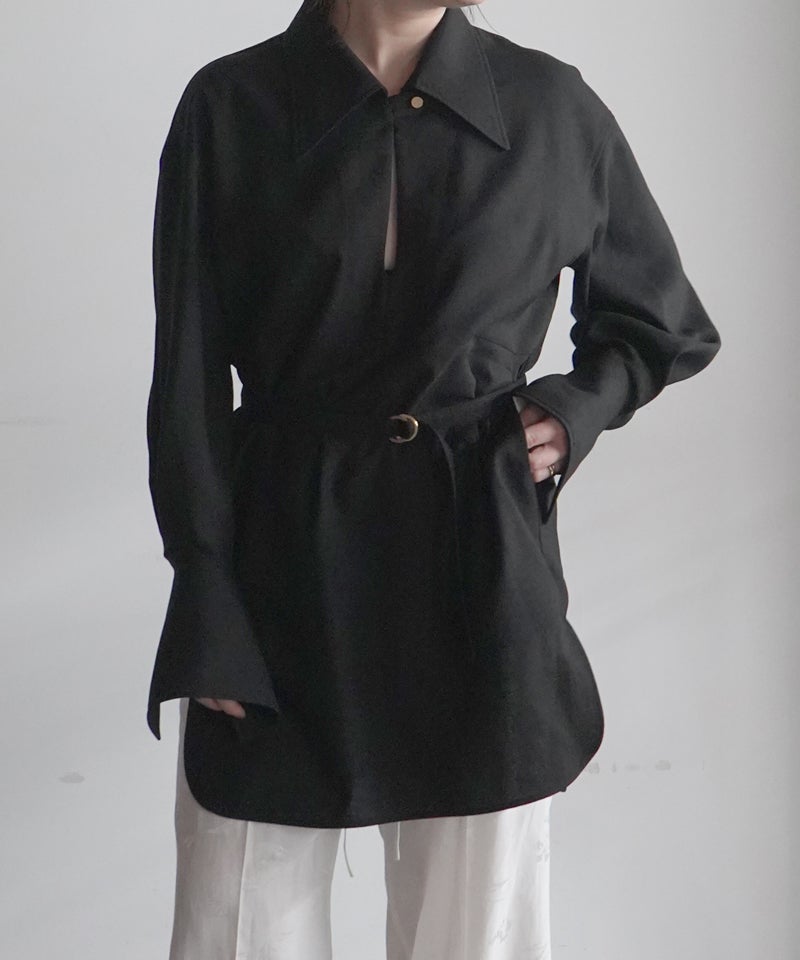 大きめの襟と大胆に開いた胸元のスリットのバランスがユニーク。