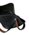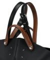 短いストラップはトップハンドルとしてお持ちいただくことができ、長いバックル付きストラップを肩にかけるときは鐙(あぶみ)のように下げておくこともできます。底面にはスタッズがあしらわれ、置いた時に自立します。
