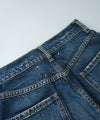 ウォッシュ加工のウォッシュジーンズ。切りっぱなしの太もも、5ポケットのスタイリング、ベルトループが特徴です。