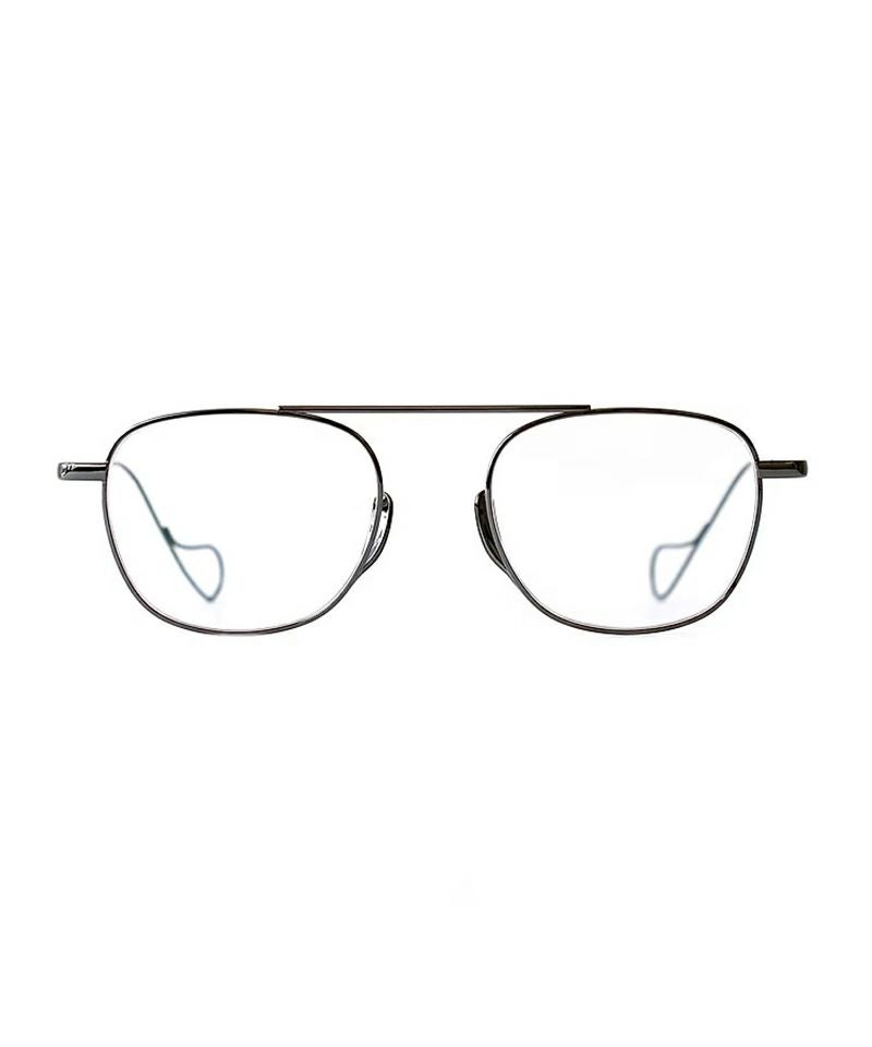 "g" (ゲー) を継承したスクウェアシェイプに、直線のバーブリッジが特徴的なバランスのよいメタルフレーム。 ノーズパットには、古いヨーロッパの眼鏡にみられたアンダースローなメタルパットを使用。 クラシカル且つモダンな印象を持つデザインとなっています。