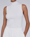タイトフィットなモックネックのスリーブレストップ。コンピュータープログラミングによって設計されたリブのラインがシャープな印象で、光沢感のあるキュプラとポリエステル糸を用いているため程よい張り感を与えてくれます。ストレッチ性に優れ、縫代がなく、快適な着心地です。