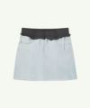 コントラスト素材のレイヤード素材を裁ちっぱなしのままウエストに配した、ひねりのあるデニムミニ。