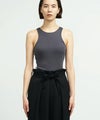 締め付けの少ない快適な着ごこちと美しいシルエットを追求した脇に縫い目の無い丸胴のバストカップ入りのアメリカンスリーブタンクトップ。